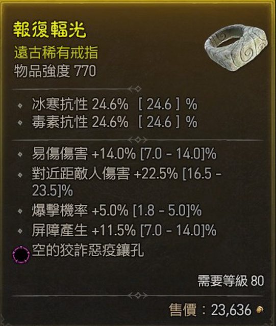 物品:D4 S1 戒指 易傷14/近距離傷22.5/爆率5/屏障11.5