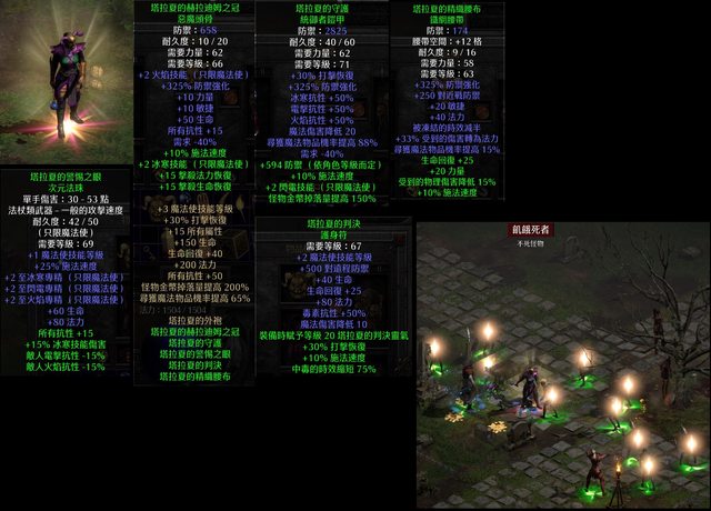此為單機修改 七大職業套裝/其他套裝/獨特/符文都改好了 趁颱風天 把之前的塔拉夏套裝再修一下 並附加更多資訊 好讀版: https://ptt.org.tw/DIABLO/M.1721869142.A.911 展示大家法師開荒神裝 其實不太需要強化的 塔拉夏套裝: https://i.imgur.com/OMwTCo6.jpg