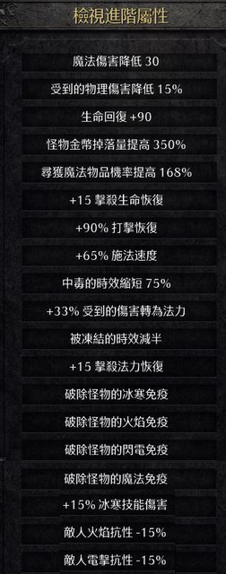 45力 45敏 300生命(額外15體力) 400法力(額外15能量) 最低裝備需求: 62力 也就是拿了火炬/毀符 還要再湊12力 附加效果: 塔拉夏的判決(靈氣) 類庇護所靈氣,但5秒發動一次(庇護所是2秒) 提供破除火/電/冰/魔免疫效果 對 不死怪物加成傷害250%(20級) 不死怪物加成準確率2500 範圍13.3碼 每5秒對範圍內不死怪物循環傷害: 基礎傷害(20級): 84-89(魔法傷害) 升級協同效果: 火/電/冰支配,每等級提供10% 以最終加總完成結果計算 (比真實去點還要多) 也就是如果你點滿 支配閃電20 又穿 塔拉夏全套 警牆 法拳 雙喬丹 又拿 火炬 毀符 又喊CTA 達到以下等級 支配閃電 38(點20) 支配火焰 19(沒點) 支配冰冷 19(點1) 得到最終傷害 722~765 傷害還是偏弱,但效果炫 (可與火/電/冰支配協同,提供魔傷跟額外對不死怪物傷害) 附加破火/電/冰/魔效果(省空間) 算是很重要的主要效果 比起法師的其他配裝 雖然不一定是最強 但提高了泛用效果 清怪還爽,就算是8PP 反正一定能打趴怪 5秒循環1次的靈氣讓逛塔拉夏古墓非常爽快 (頻率太高畫面反而會很亂) 當然還是不適合打終極紅門 (不過紅門內的不死怪會自己彈開就是爽) 之前的套裝: 艾爾多套裝(德魯伊): https://ptt.org.tw/DIABLO/M.1709954311.A.D6A 娜塔亞套裝(刺客): https://ptt.org.tw/DIABLO/M.1709963819.A.F16 不朽之王/布魯凱索套裝(野人): https://ptt.org.tw/DIABLO/M.1709986542.A.1F6 格里斯瓦德套裝(聖騎): https://ptt.org.tw/DIABLO/M.1709996565.A.F95 桓因的威嚴(野人/野人傭兵可用): https://ptt.org.tw/DIABLO/M.1710035139.A.CED 塔格奧套裝(死靈): https://ptt.org.tw/DIABLO/M.1710553538.A.A0F 馬維娜之戰鬥詩歌(亞馬): https://ptt.org.tw/DIABLO/M.1710573529.A.2D4 孤兒的呼喚: https://ptt.org.tw/DIABLO/M.1710681586.A.EA1 門徒: https://ptt.org.tw/DIABLO/M.1711462201.A.EC7 娜吉的上古遺物: https://ptt.org.tw/DIABLO/M.1711710356.A.7BF 沙薩比的崇高禮讚:(槍伯可用) https://ptt.org.tw/DIABLO/M.1711880356.A.A70 地獄工具:(羅格可用) https://ptt.org.tw/DIABLO/M.1712070336.A.7C0 -- ◢███ ◢███ ████ ◢◤ ████ ███ ◢◤ ████ ██ ████ -- ※ 發信站: 批踢踢實業坊(ptt.org.tw), 來自: 111.246.129.109 (臺灣) ※ 文章網址: https://ptt.org.tw/DIABLO/M.1721869142.A.911