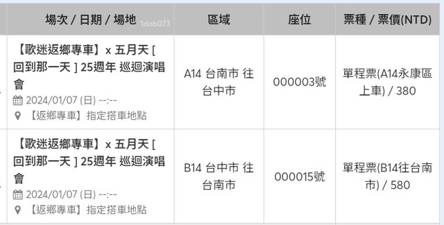 標題[售票] 五月天 1/7 1880站區+台南返鄉車票