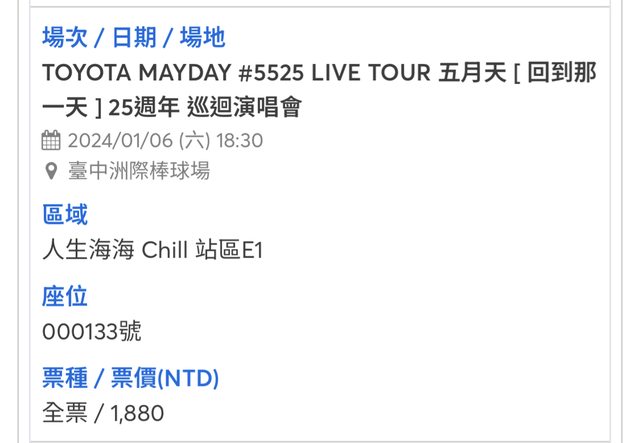 標題[售票] 五月天1/6人生海海E1站區1張