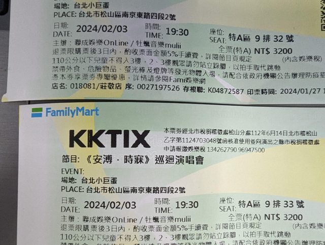 標題[售票]《安溥.時寐》巡迴演唱會 特A區 32&33