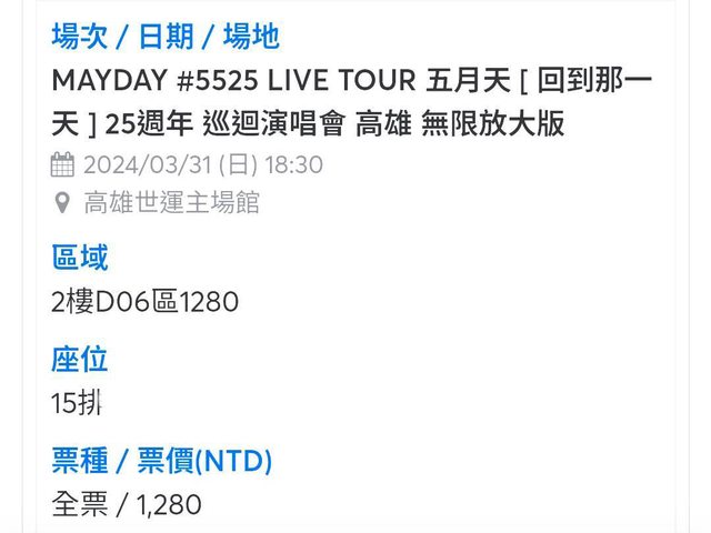 標題[售票] 五月天 3/31 2樓D06 1280單張