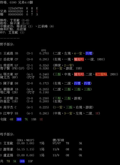 終場,G180 兄弟4:0獅