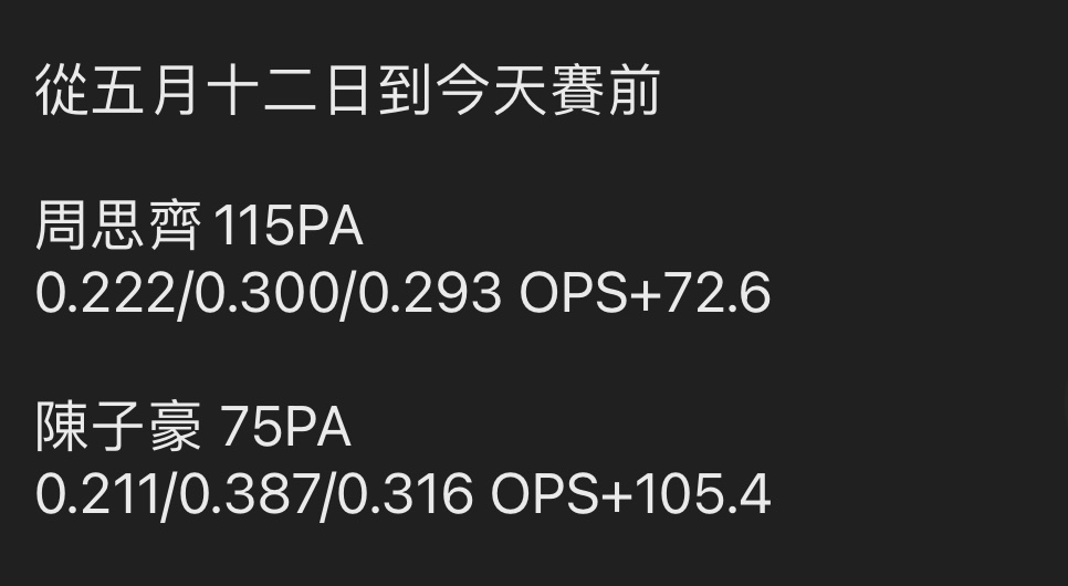asdrt: 是說周打龍是很好啦. avg.333 obp .438 ops+185 08/11 16:59