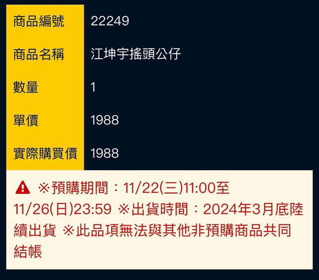 推 trainmay: 阿坤公仔是去年11月底預購,今年3月底陸續出貨,沒有蓋 04/10 14:38