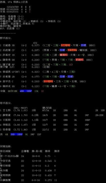 標題[情報] G74 悍將4:5兄弟 全場數據box
