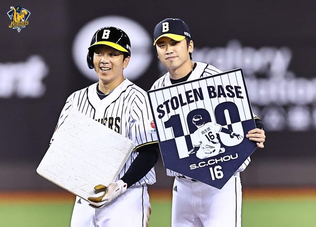中信兄弟42歲老將周思齊,16日在台北大巨蛋完成生涯第100次盜壘成功,在20533人名球