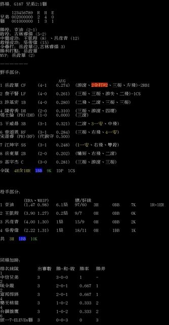 標題[情報] G187 兄弟2:1獅 全場數據box