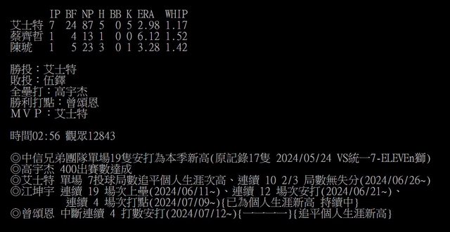 ◎艾士特 單場 7投球局數追平個人生涯次高、連續 10 2/3 局數無失分(2024/06/26~)