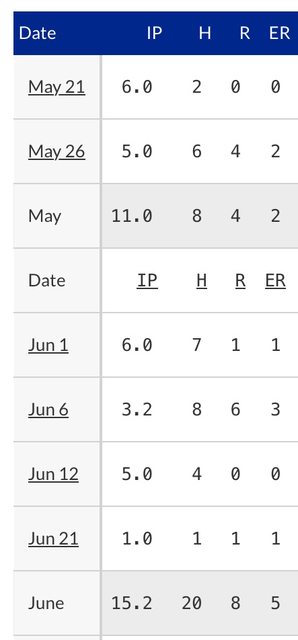 34歲 G:6 GS:5 IP:26.2 ERA:2.36 WHIP:1.28(3A)