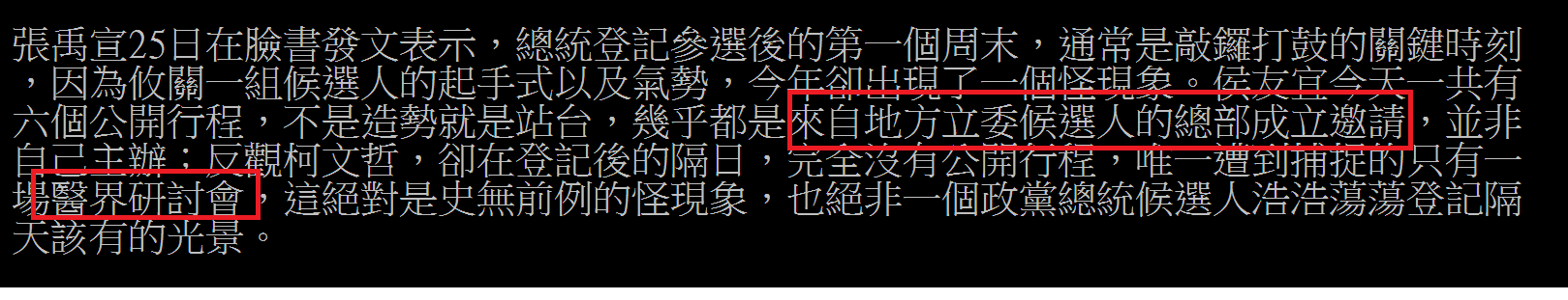 : 張禹宣25日在臉書發文表示,總統登記參選後的第一個周末,通常是敲鑼打鼓的關鍵時