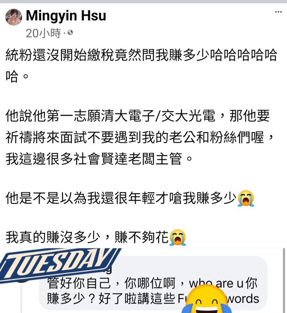 噓 sam2255: 你賺多少?答:我老公和粉絲賺很多…? 150.117.33.106 04/10 17:42