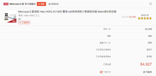(1)Mercusys水星網路Halo H50G AC1900 全家庭式Mesh Wi-Fi 無線路由器 三入組