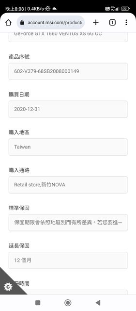 2、2020年12月在Nova購入,沒挖礦,後來補註冊延保有審核通過,不確定後續保固會不會?