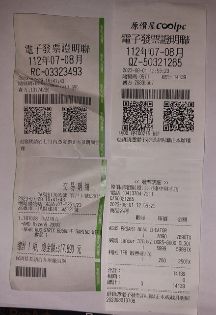 R9 7900X於2023-7月購自欣亞,ASUS B650-Creator 2023-8月購自原價屋