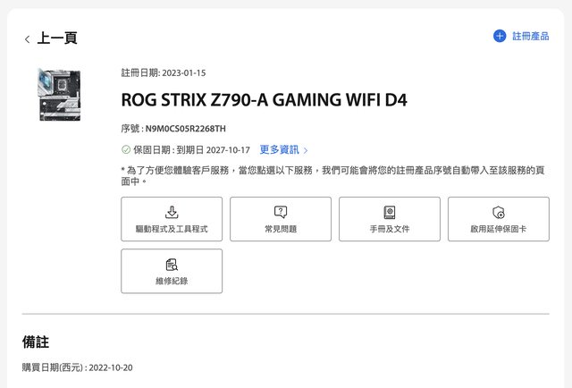 2022 年 10 月 23 日購入,有登入延長保固到 2027 年 10 月 17 日。