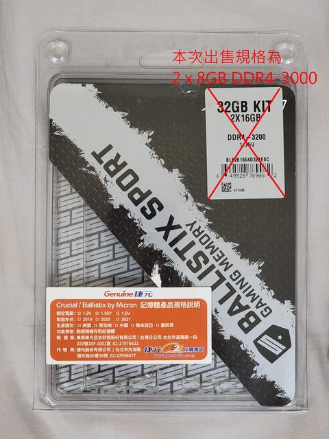 標題[賣/台北/皆可] Micron美光 Ballistix SportAT DDR4 3000 16G(8G*2)