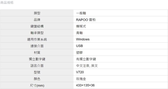◎硬體型號: 雷柏 RAPOO 機械遊戲鍵盤 VPRO V720(青軸)全彩RGB背光-黑色