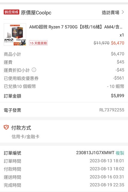 5700G於去年8月蝦皮原價屋購入保內