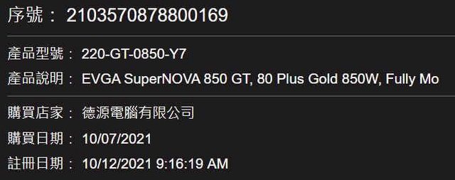 5. PSU EVGA 850GT 無盒,2021/10註冊