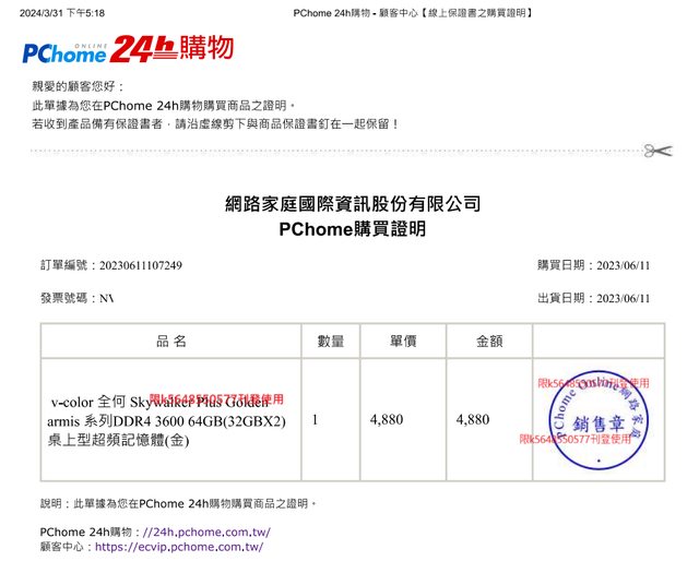 a. 2023/06/11,PCHOME購買,原電腦改用ECC記憶體正常使用換下,可至正常DOCP至3600