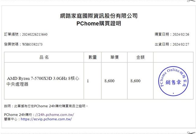 1.5700X3D 113/2/26於PCHOME 購買,原廠盒裝保固三年(建達國際)。