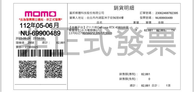 CASE:2023/06/24 Momo購入(有盒有發票)無