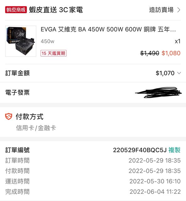標題[賣/全國/寄送]EVGA BA 450W 銅牌電源供應器
