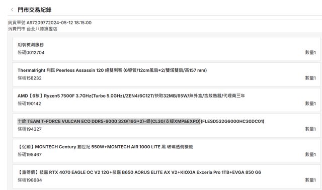 硬體型號:十銓 T-FORCE VULCAN ECO DDR5-6000 32G(16G*2)-銀(CL30/支援XMP&EXPO)