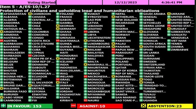 : 人道停火的決議案進行表決,結果193個國家中,共獲得153票贊成、10票反對、23票棄權