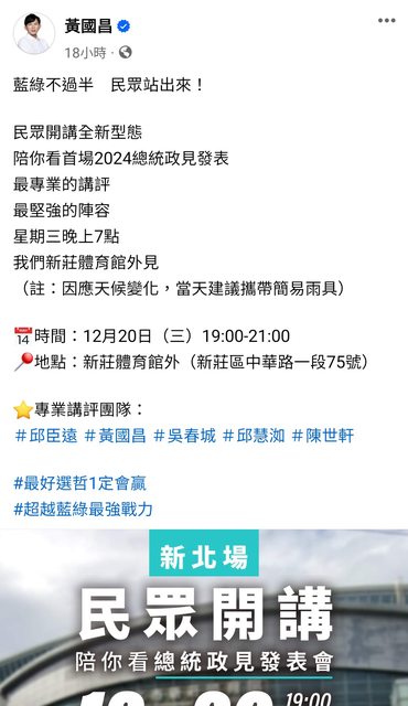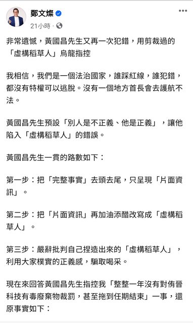 https://bit.ly/482TQpL 目前黃國昌還沒有最新回應 只宣傳啥民眾開講 發文時間晚於鄭那篇文 https://i.imgur.com/9J94Ncd.jpg