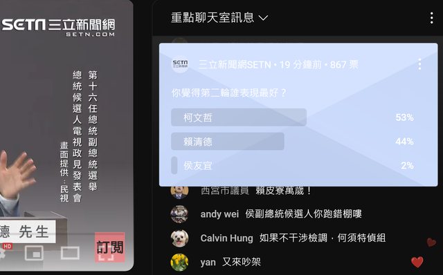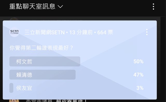 三立的主戰場 YOUTUBE台 聊天室的民調統計 柯文哲 第一 賴清德 第二 侯友宜 也是第一 侯友宜 似乎很少辯論 面對柯文哲和賴清德 表現有點怯場 手抖 侯友宜 請下次加油 -- ※ 發信站: 批踢踢實業坊(ptt.org.tw), 來自: 218.35.2.144 (臺灣) ※ 文章網址: https://ptt.org.tw/HatePolitics/M.1703078590.A.909