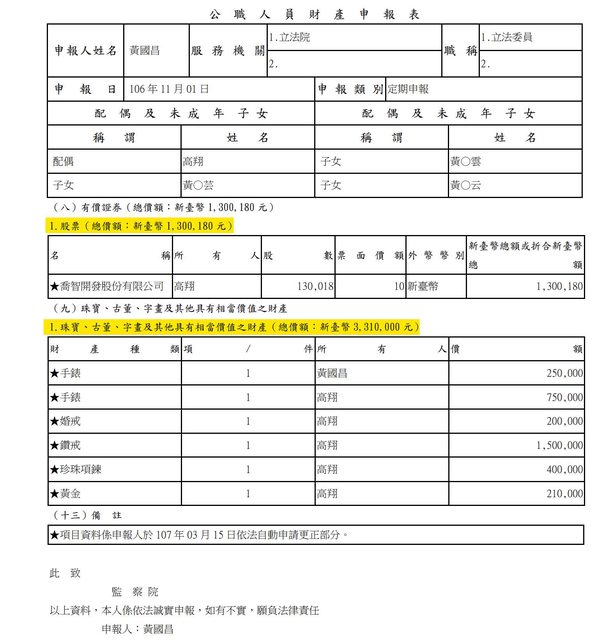 ※ 引述《LeeSeDol (嘖嘖...)》之銘言: : 賴清德拋萬里老宅做公益 黃國昌批「終於承認房子是他的」:為何從未誠實申報 : https://www.storm.mg/article/4956850 : 風傳媒 : 中選會20日舉辦2024總統大選首場總統電視政見發表會,民進黨總統候選人主動提及萬 : 里老宅,表示未來願意將房屋交付公益信託,興建礦工生活紀念館。對此,民眾黨不分 : 區立委提名人黃國昌指出,今天政見發表會最重要的發現,是賴清德終於掀底牌,承認 : 該棟房屋是他所有的,質疑為何提交給中選會的財產申報上沒有這棟房子?賴清德沒有 : 誠實申報該棟房屋,監察院要不要辦? 反觀最誠實申報的黃國昌, 黃國昌第一次當立法委員的時候, 前兩次財產申報(廉政專刊第108期和128期) 都不小心漏掉了130萬的股票和331萬的珠寶, 在2018年廉政專刊(136期)才補報, 只要查詢監察院網站, 搜尋黃國昌就能找到一筆『更補正申報』的資料. https://i.imgur.com/dqy6OKU.jpg