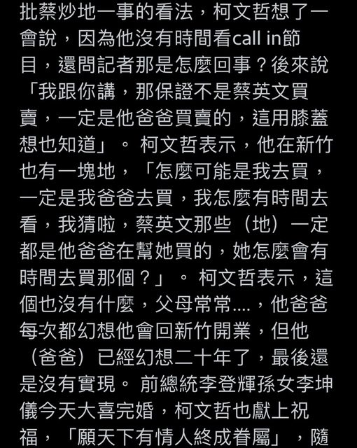 → honen: 柯粉不知道柯爸很會賺錢炒地皮嗎 111.71.213.235 12/22 11:50