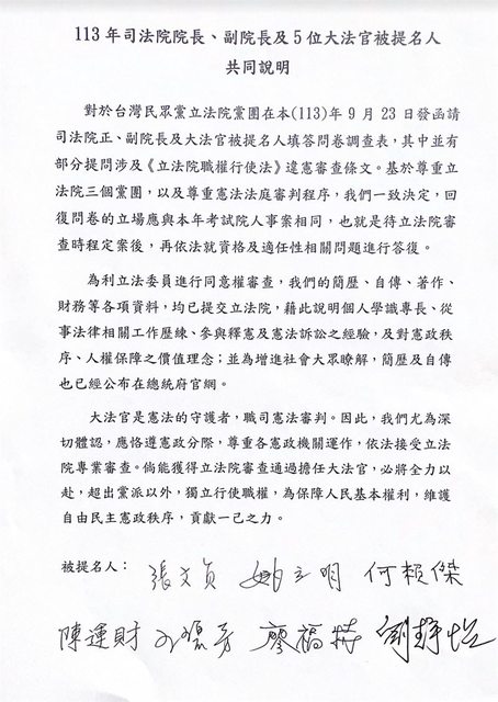 民眾黨提問卷!大法官被提名人共同發聲了:待立院審查時程定案後答復
