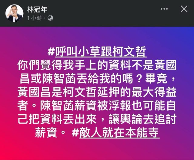 → YouGot5566: 林冠年爆料一直都很真實 之前高虹安都 116.241.152.20 10/28 23:55