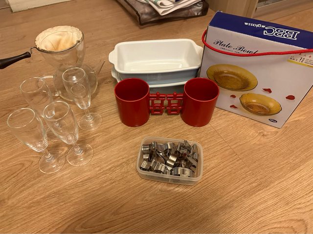2. 廚房用品:玻璃杯盤,咖啡壺,雙喜杯,餅乾模,烤盤
