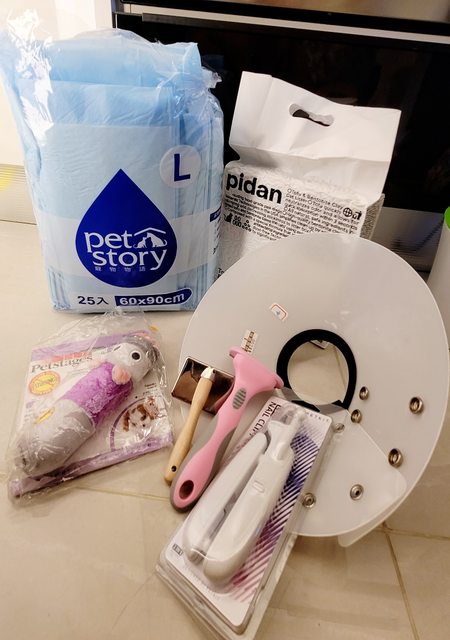 3.尿布墊(拆封未用)+貓砂(全新)+貓咪梳子兩把+指甲剪+貓玩具(全新)+貓咪頭罩