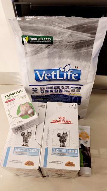 2.法米納貓用極低敏配方飼料(乾糧約剩1/5包,濕糧有17還18包)+營養膏+老貓關節保