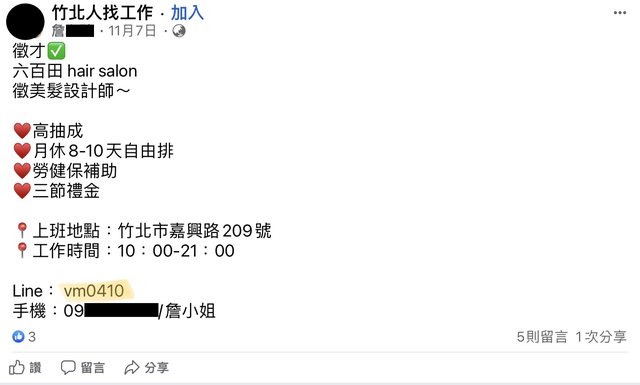推 YCL13 : 所以最新的說法是,姐姐開店並在FB用自己帳號徵才, 11/19 11:14