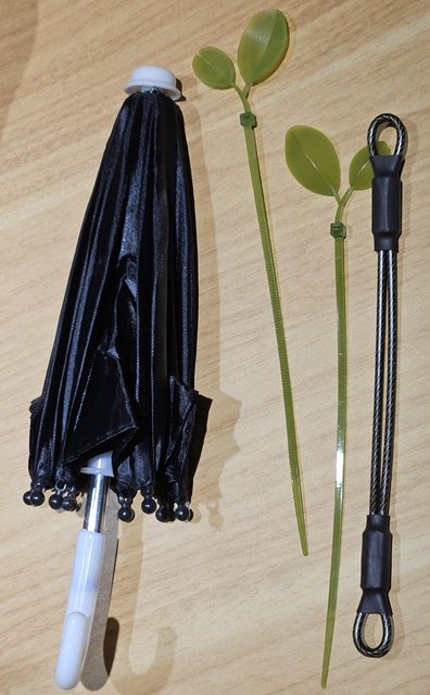 共有四個物件(小黑傘,兩根束繩,一根黑金屬繩)