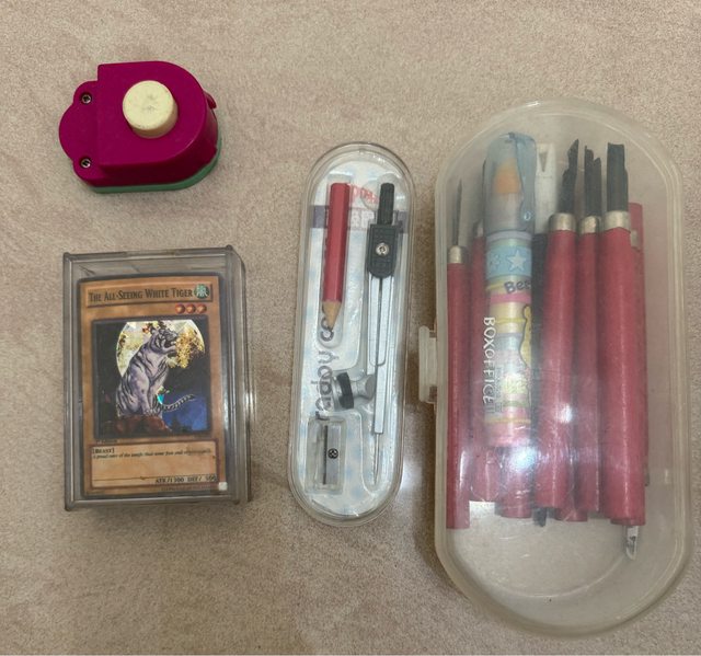 圓規(洽、雕刻筆、遊戲王卡、造型打洞機(已送出、紙膠帶(已送出