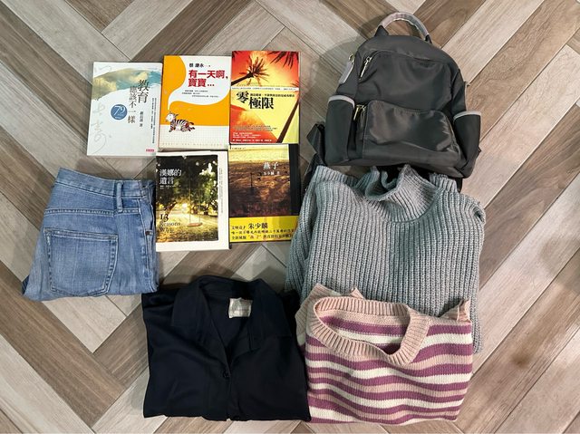 物品項目:書5本、毛衣2件、uniqlo25腰牛仔褲1件、長版襯衫1件、包包1個