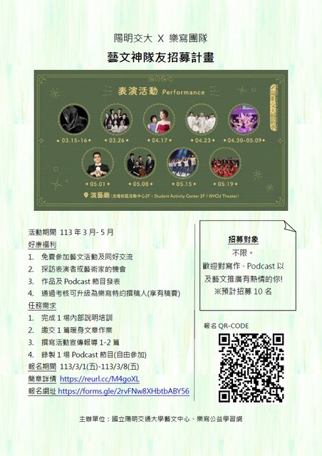 具熱情與實務能力之寫作志工,參與藝文活動並撰寫相關報導,及在Podcast節目進行分