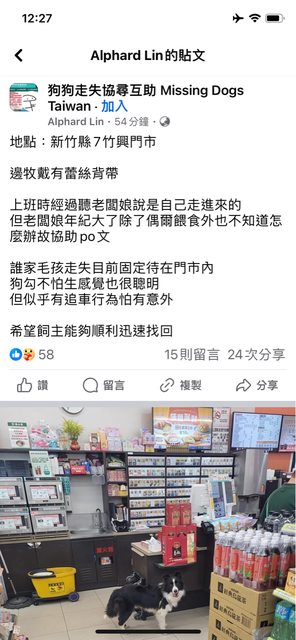 誰家毛孩走失目前固定待在門市內