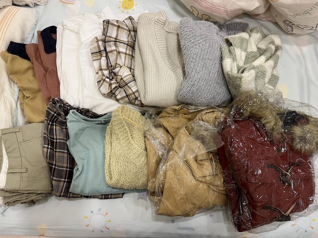 有兩件厚外套、多件毛衣和襯衫,長袖短袖都有,還有一件男生長褲。