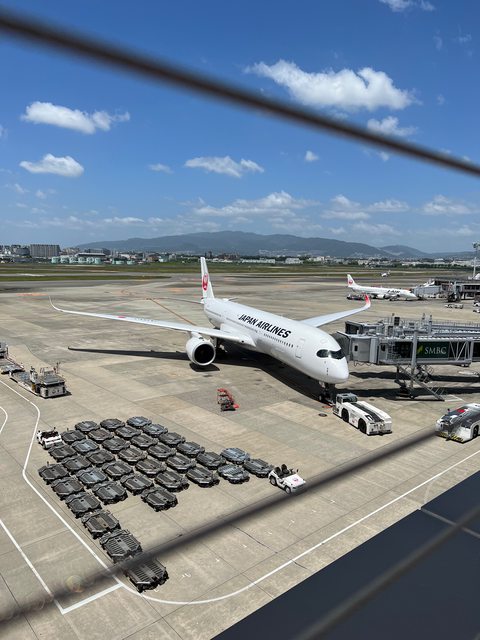 借一張在伊丹看到的A350-900。A350的特徵是「漢堡神偷」造型的擋風玻璃,以及弧形上