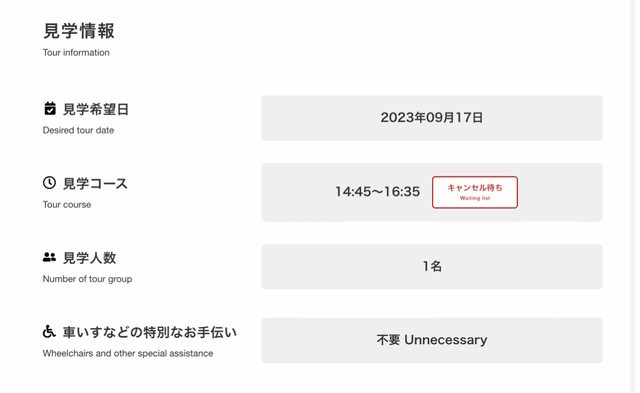 每週一、二、四、六、日各有一天三個場次的見學行程,分別為09:30、10:45、14:45。