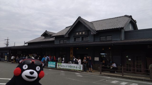 到了阿蘇車站後,在照片中排隊人龍處買販賣機販售的阿蘇火口路線一日券